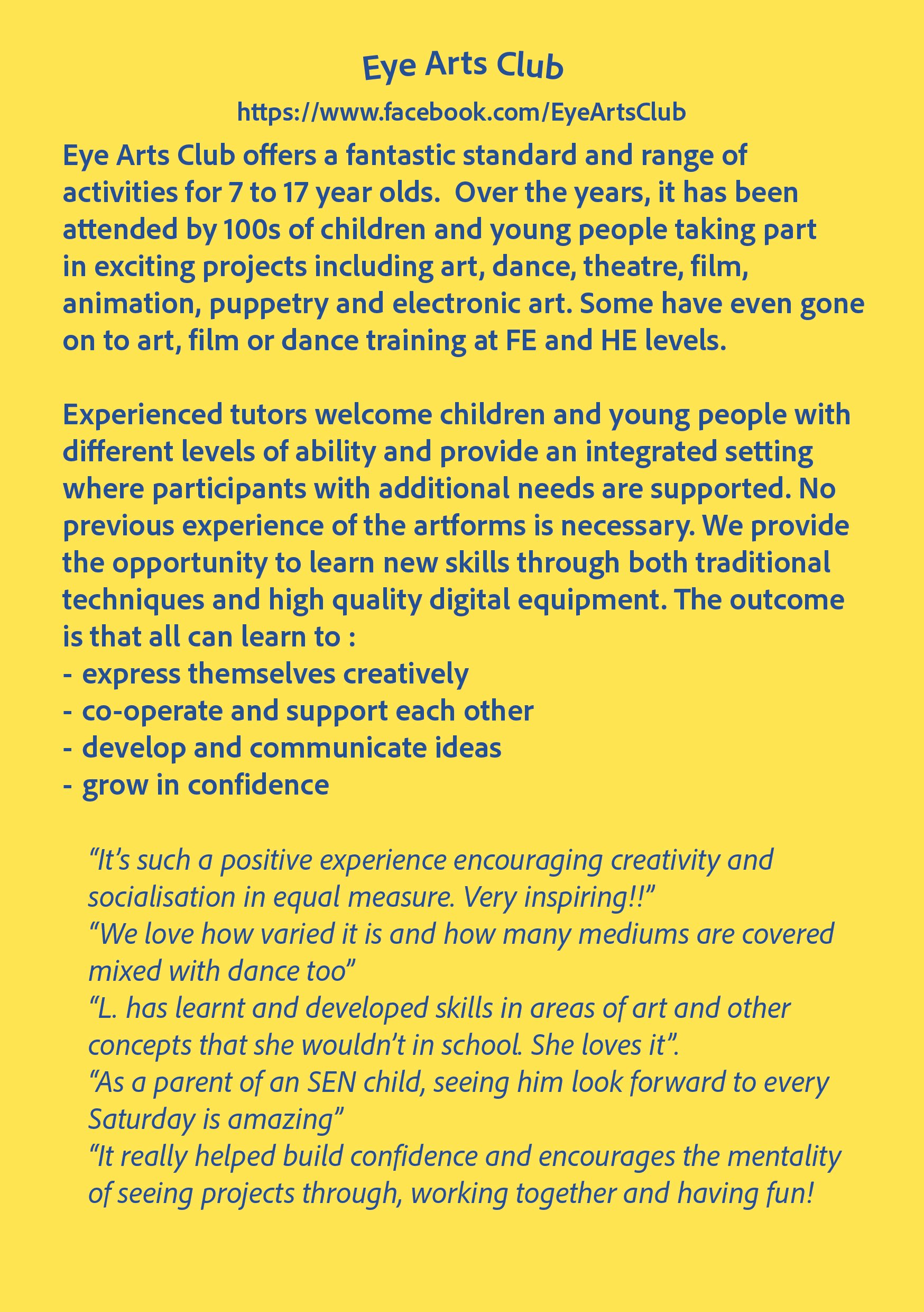 Koan Arts has taken over management of Eye Arts Club, which runs arts projects for 7 to 17+ year olds, with and without additional needs, who live in Eye, Suffolk, and surrounding villages.